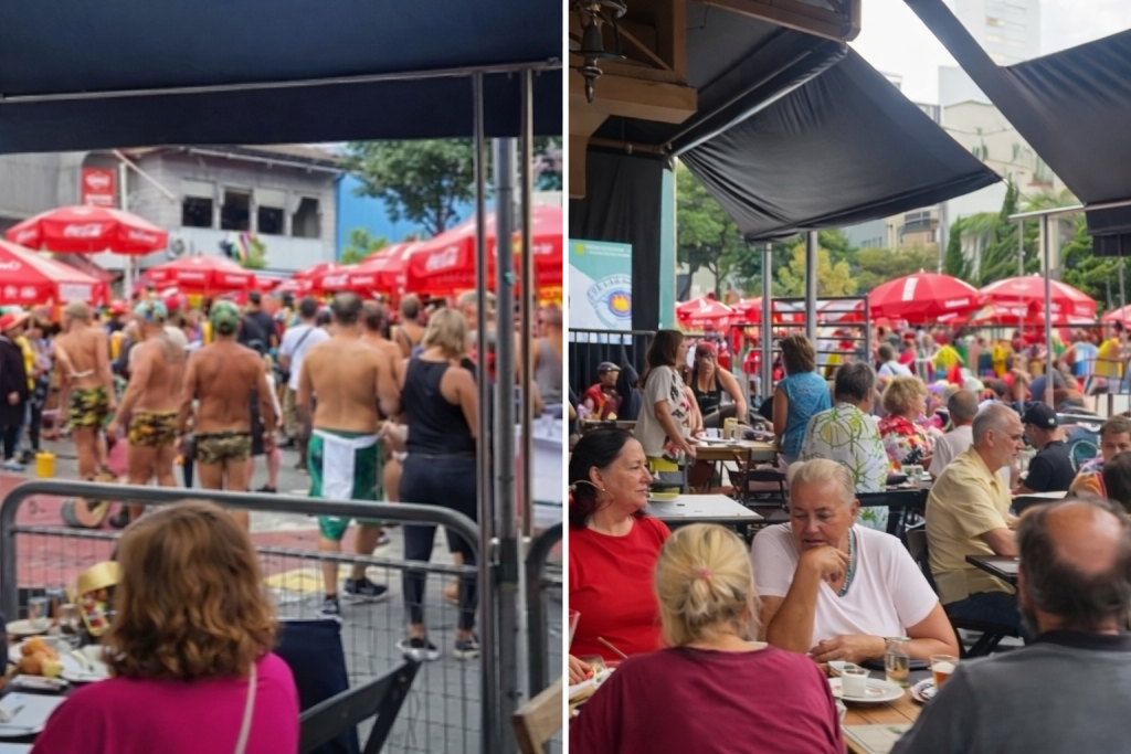 No entanto, publicação nas redes sociais do estabelecimento mostra a calçada fechada durante a passagem de blocos. No material divulgado, o restaurante informa cobrança antecipada de R$ 250 por pessoa, valor revertido em consumação mínima. Também são mencionadas opções de “camarote” no terraço e área com open bar em frente à unidade Cafeteria, cujo preço não foi informado.